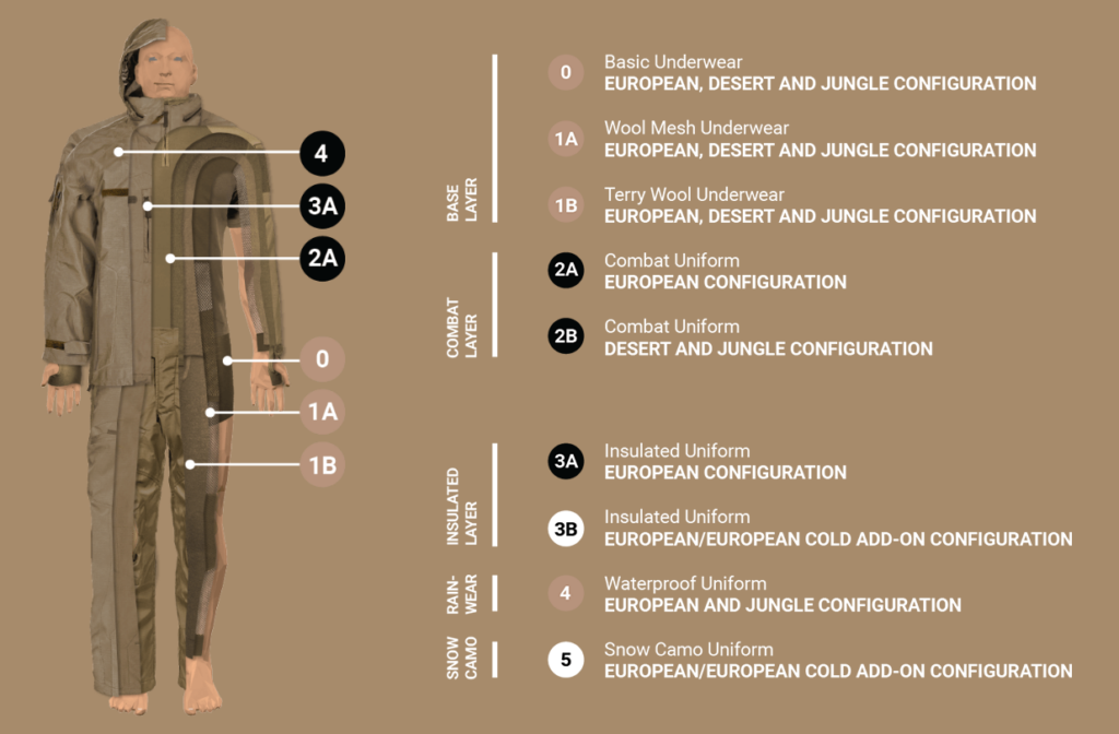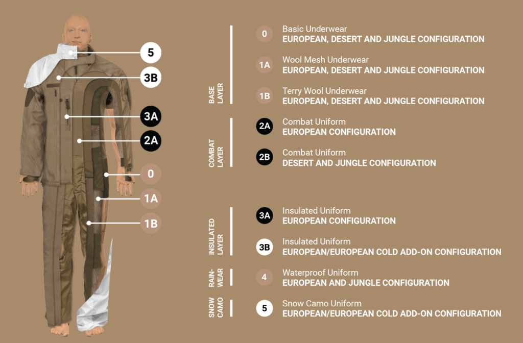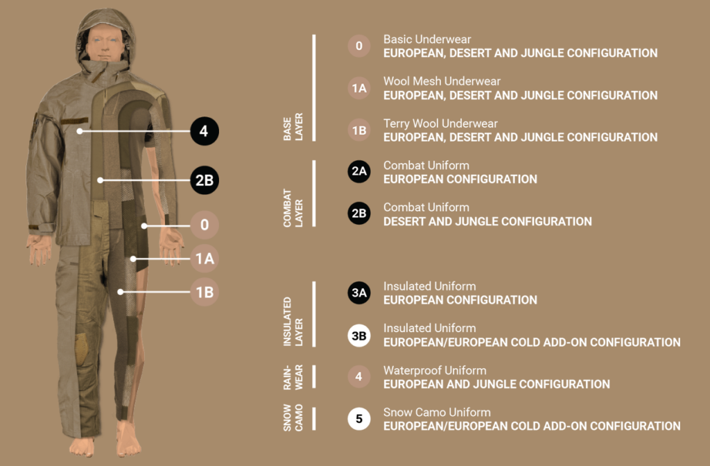 The soldier should always wear Layer 0 (except t-shirt), and Layer 2A Trousers in combination with combat shirt or jacket.